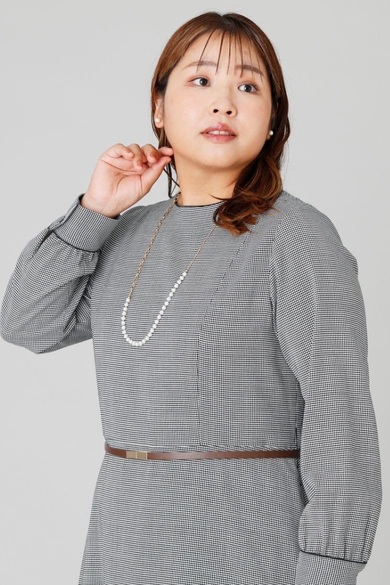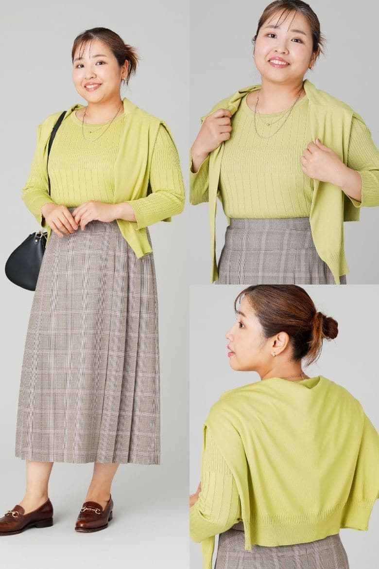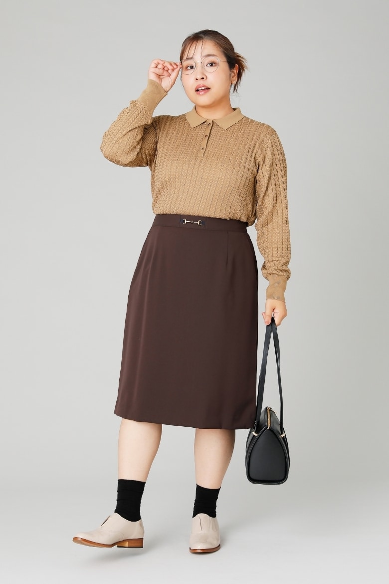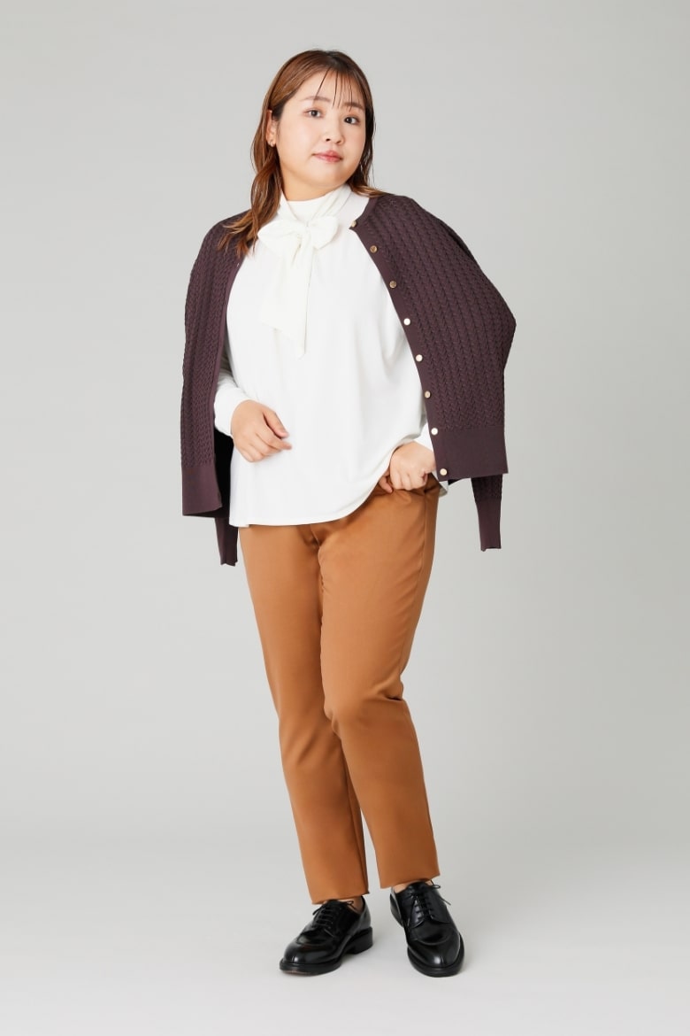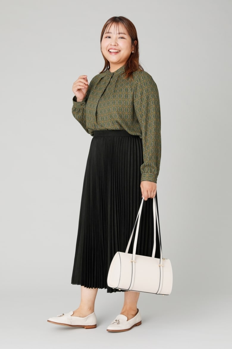 秋らしい空気を感じながらも、日中はまだ軽やかな装いで過ごしたいこの時期。ジャケットに頼らずきちんと感を演出できるオフィススタイルをプラスサイズモデルの吉野なおさんに着ていただきました! 吉野なおnao yoshino プラスサイズモデル・エッセイスト 2013年、雑誌『ラ・ファーファ(発行:文友舎)』第1号目からモデルとしてのキャリアをスタート。プラスサイズのファッションモデルとして活動しながら、摂食障害の経験をもとにコラム執筆やイベント講演なども行う。著書に『コンプレックスをひっくり返す~見た目のなやみが軽くなるボディ・ポジティブな生き方~』(発行:旬報社)。 01 知的かつ親しみやすい秋色パンツスタイル 洗濯機洗いOKでシワになりにくいブラウス見えカットソーは、忙しい毎日に頼れるアイテム。リボン結びしたボウタイが、顔周りに華やぎを添えてくれます。縦に流れるケーブル編みニットやテーパードパンツで、スタイリッシュにまとめました。[着用サイズ:全てL15号] Cardigan ¥20,900 CHECK Cut&Sewn ¥15,400 CHECK Pants ¥18,700 CHECK 02 総柄ブラウスはくすみカラーで大人な表情に 落ち着いたトーンの柄ブラウスは、普段シンプルな装いが多い方にも取り入れやすい1枚。スエードタッチのプリーツスカートで季節感と縦長シルエットを演出しました。小物でホワイトを足せば、程よい抜け感のある着こなしが完成![着用サイズ:全てL15号] Blouse ¥23,100 CHECK Skirt ¥28,600 CHECK Bag ¥36,760 CHECK Shoes ¥23,100 CHECK 03 小物で差がつくこなれワンピーススタイル 1枚でサマになるワンピースは、ラクな着心地も好印象も叶う優秀アイテム。パールのアクセサリーや革小物をプラスすると、メリハリのある着こなしに仕上がります。オフィスではもちろん、会食やお仕事終わりのお出かけにも対応できるスタイルです。[着用サイズ:全てL15号] Dress ¥37,400 CHECK Necklace ¥6,600 CHECK Belt ¥11,000 CHECK Scarf ¥16,500 CHECK 04 花柄をシックに見せる大人の引き算コーデ 甘くなりがちなフラワー柄のアイテムは、青みのトーンでクールな表情に。リラックス感のあるワイドシルエットのパンツやフラットシューズを合わせて、クラシカルな印象のシャツを程よくカジュアルダウンさせました。[着用サイズ:全てL15号] Blouson ¥28,600 CHECK Blouse ¥25,300 CHECK Pants ¥18,700 CHECK 05 トラッドスタイルは鮮やかカラーで軽快に カラーアイテムを取り入れるなら、きちんと感も演出できるハイゲージニットがおすすめ。肌寒い時にサッと羽織れるアンサンブルは、オフィスでの体温調節にも役立ちます。チェック柄スカートとローファーを合わせれば、トラッド感のある着こなしに。[着用サイズ:全てL15号] Cardigan ¥20,900 CHECK Knit ¥18,700 CHECK Skirt ¥41,800 CHECK Necklace ¥8,800 CHECK 06 定番ブラウンを華やかにアップデート 秋らしく洗練された雰囲気を感じる、ブラウントーンのグラデーション。襟元のメタル釦やスカートのビットパーツで、落ち着いた色合いにツヤ感をプラスしました。足元はあえてショートソックス×スリッポンでさりげなく遊び心を添えて。[着用サイズ:全てL15号] Knit ¥18,700 CHECK Skirt ¥19,800 CHECK Bag ¥36,740 CHECK Shoes ¥27,500 CHECK 掲載アイテム一覧はこちら Lサイズ新作アイテムはこちら Lサイズ取扱ショップ一覧はこちら 試着・来店予約をする PAGE TOP