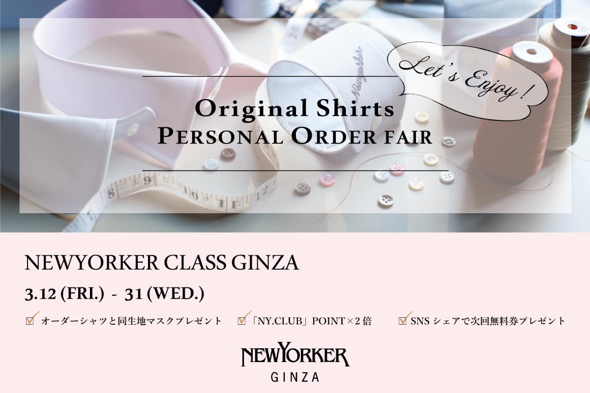 2021.3.9 約500種のファブリックからチョイス! 幅広い補正範囲でオリジナルの一着をお作りする Let's Enjoy Original Shirts! PERSONAL ORDER FAIR お客様の体型やお好みに合わせて、自分だけの一着をお作りする「ニューヨーカー パターンオーダー」。 このたび、ニューヨーカー銀座フラッグシップショップから徒歩1分の場所にある パターンオーダー専用ラウンジ「ニューヨーカークラス銀座」にて、 春夏シーズンのコーディネイトの主役級アイテム"シャツ”にフォーカスした 「Let's Enjoy Original Shirts! PERSONAL ORDER FAIR」」を開催いたします。 普段使いのカジュアルから、ビジネスや特別な日のドレスタイプまで、 またこれからのシーズン、アウターのように羽織りとしても 着回しが楽しめるシャツは、何枚あっても重宝するアイテム。 豊富な生地とデザイン、個性をプラスできるオプションを自由に組み合わせて、 自分だけのオリジナルシャツを作りませんか? 補正範囲やサイズ調整も幅広く、 これまでご自分のサイズに合うシャツが見つからなかった方にもおすすめです。 ニューヨーカークラス銀座は完全予約制のパターンオーダーラウンジです。 ご来店の際は、二ューヨーカー銀座フラッグシップショップまでご連絡いただきますようお願い申しあげます。 当日は、ゆったりとした空間の中でドリンクをお楽しみいただきながら、 パターンオーダーを熟知したコンシェルジュが対応させていただきます。 ■ イベント詳細 【会期】 3月12日(金 )~ 31日(水) 【開催店舗】 ニューヨーカクラス銀座 【3大特典】 ① オーダーをいただいたシャツと同生地のマスクをプレゼント。 ② 「NY.CLUB」のポイントが通常時の2倍 ③ ご自身のインスタグラムでオーダーシャツを投稿、 またはニューヨーカー銀座店のインスタグラムでオーダーシャツをご紹介させていただいた方の中から抽選で1名さまに 次回ご利用いただけるシャツオーダー無料チケットをプレゼント。 ※本イベントはニューヨーカークラス銀座店限定です。他店舗では開催しておりません。 ※シャツオーダーはメンズ、ウィメンズ両方ございます。 ※仕上がりまで約4週間いただきます。 ※特典対象はパターンオーダーシャツです。 ※プライスは¥11,000(税込)~です。 ※本サービスは、他のサービスとの併用はいたしかねます。 ■ 二ューヨーカー銀座フラッグシップショップ詳細 所在地:〒104-0061 東京都中央区銀座1-5-13 ゼットエックスビル1・2階 電話番号:03-6228-7001 営業時間:11:00〜19:00(不定休) ▽NEWYORKER GINZA Shop blog MEN: https://newyorker-shopblog.com/brand/newyorker-men/shop/ginza-mens WOMEN: https://newyorker-shopblog.com/brand/newyorker-women/shop/ginza-womens ▽NEWYORKER GINZA instagram https://www.instagram.com/newyorker_ginza/DDRESS ▽NEWYORKER GINZA face book https://www.facebook.com/NEWYORKER.GINZA/ ▽NEWYORKER公式face book https://www.facebook.com/NEWYORKER.Since1964/ ▽NEWYORKER公式instagram https://www.instagram.com/newyorker.since1964/ |